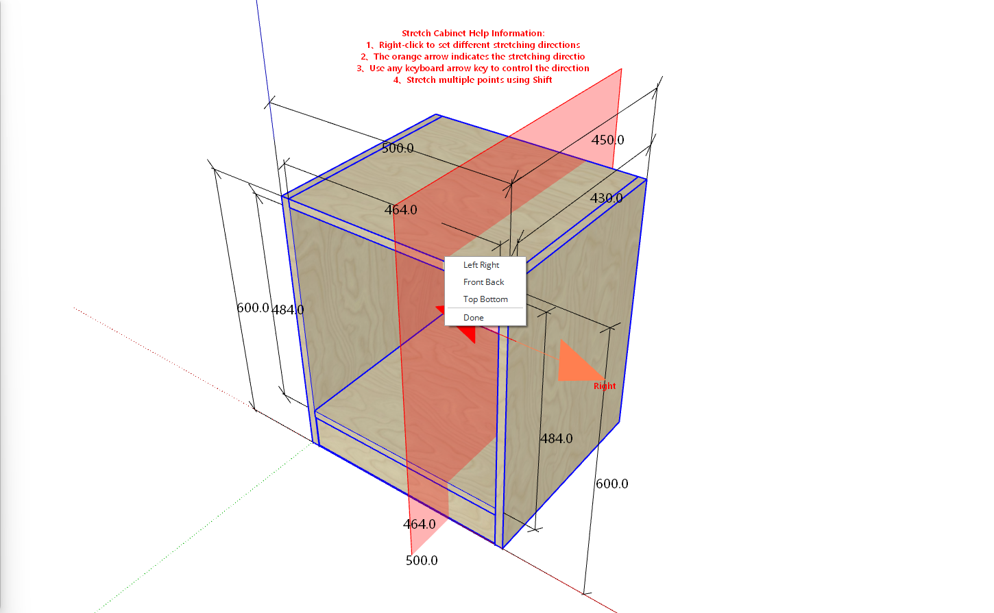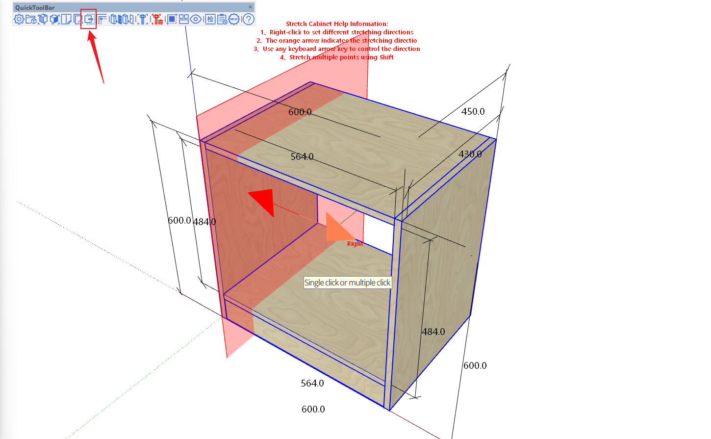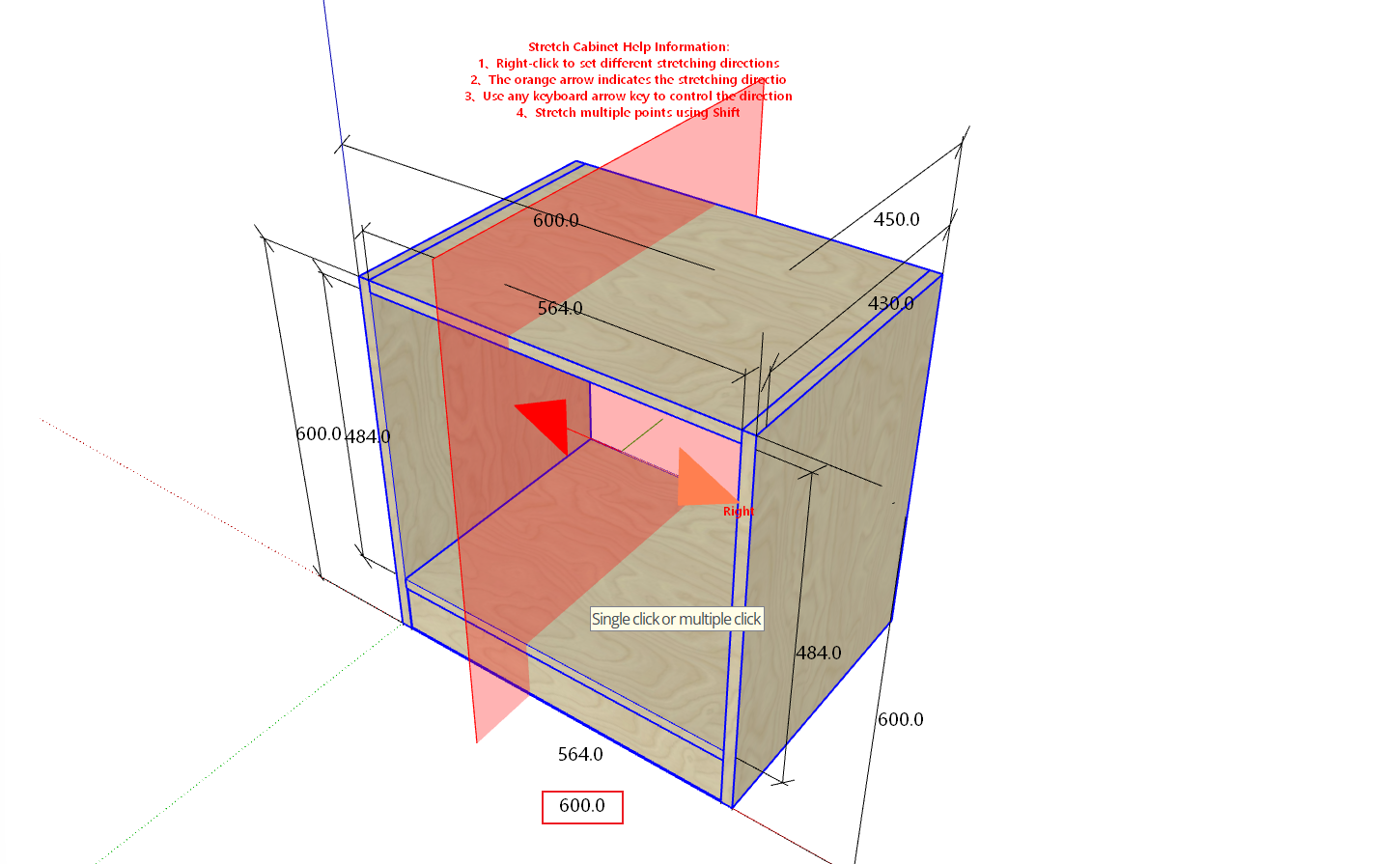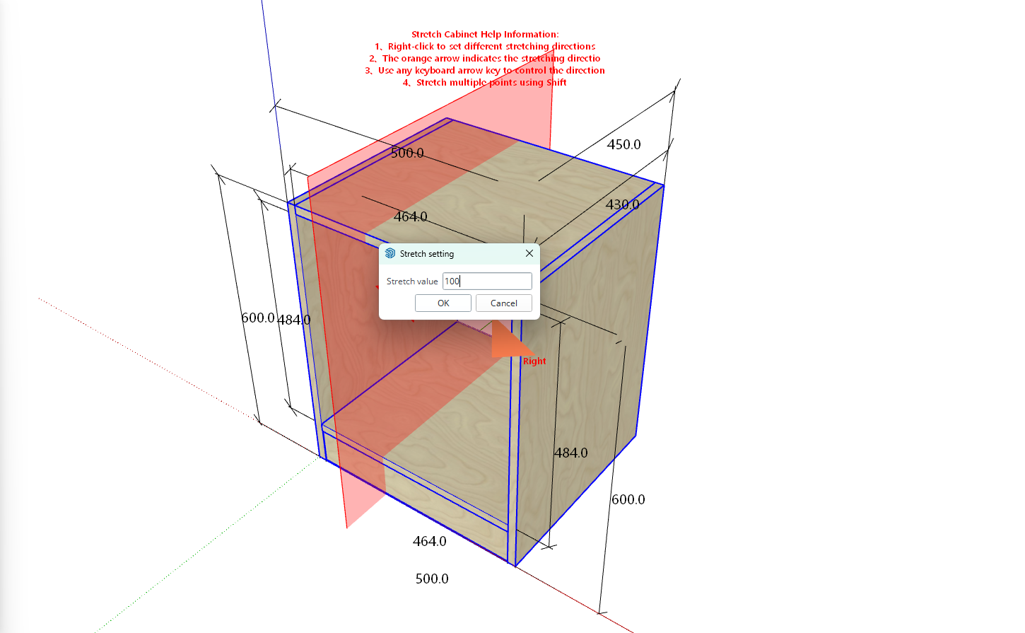 - Enter a distance of 100, and the cabinet will stretch 100mm along the orange arrow direction starting from the mouse click position