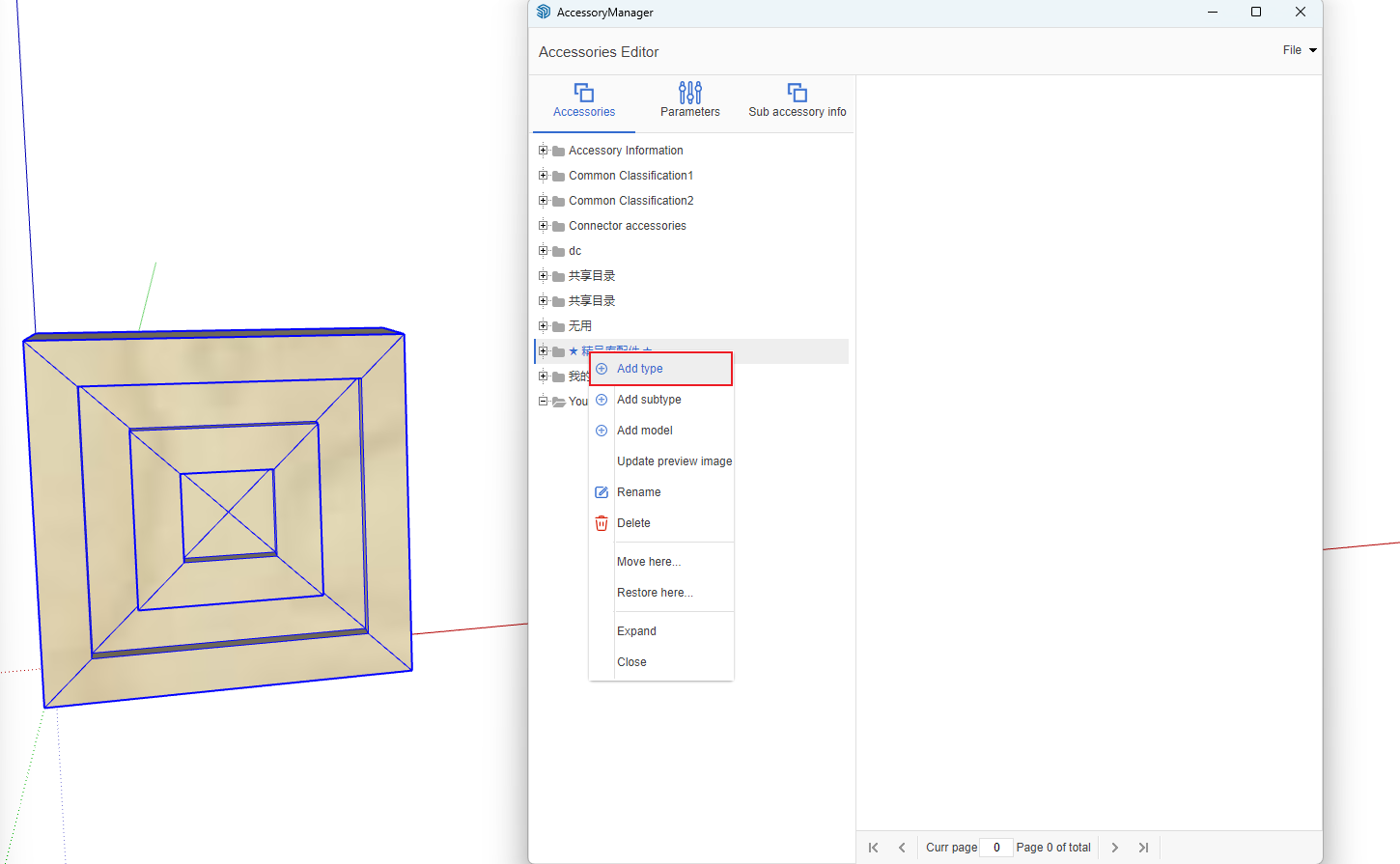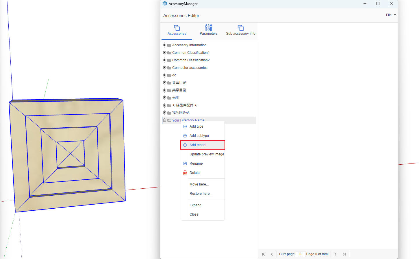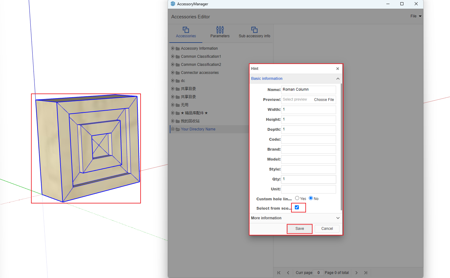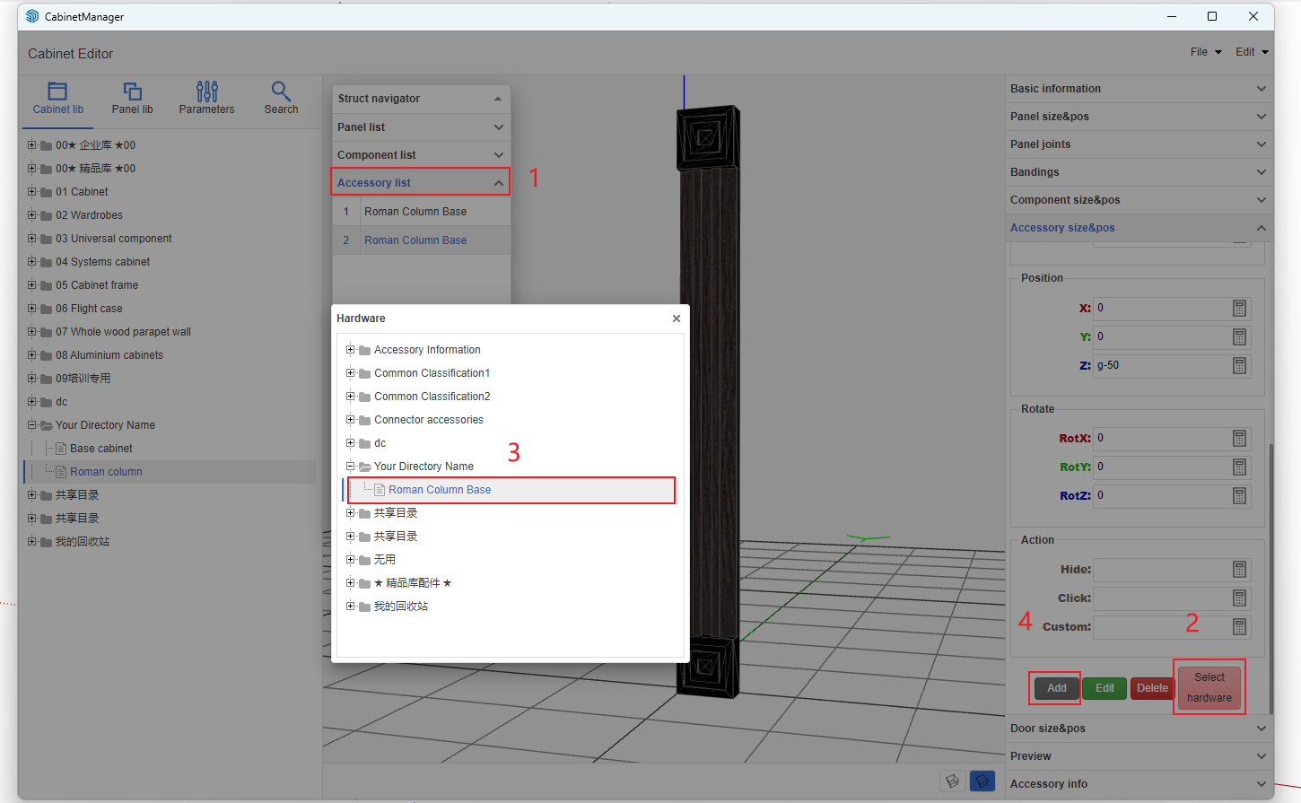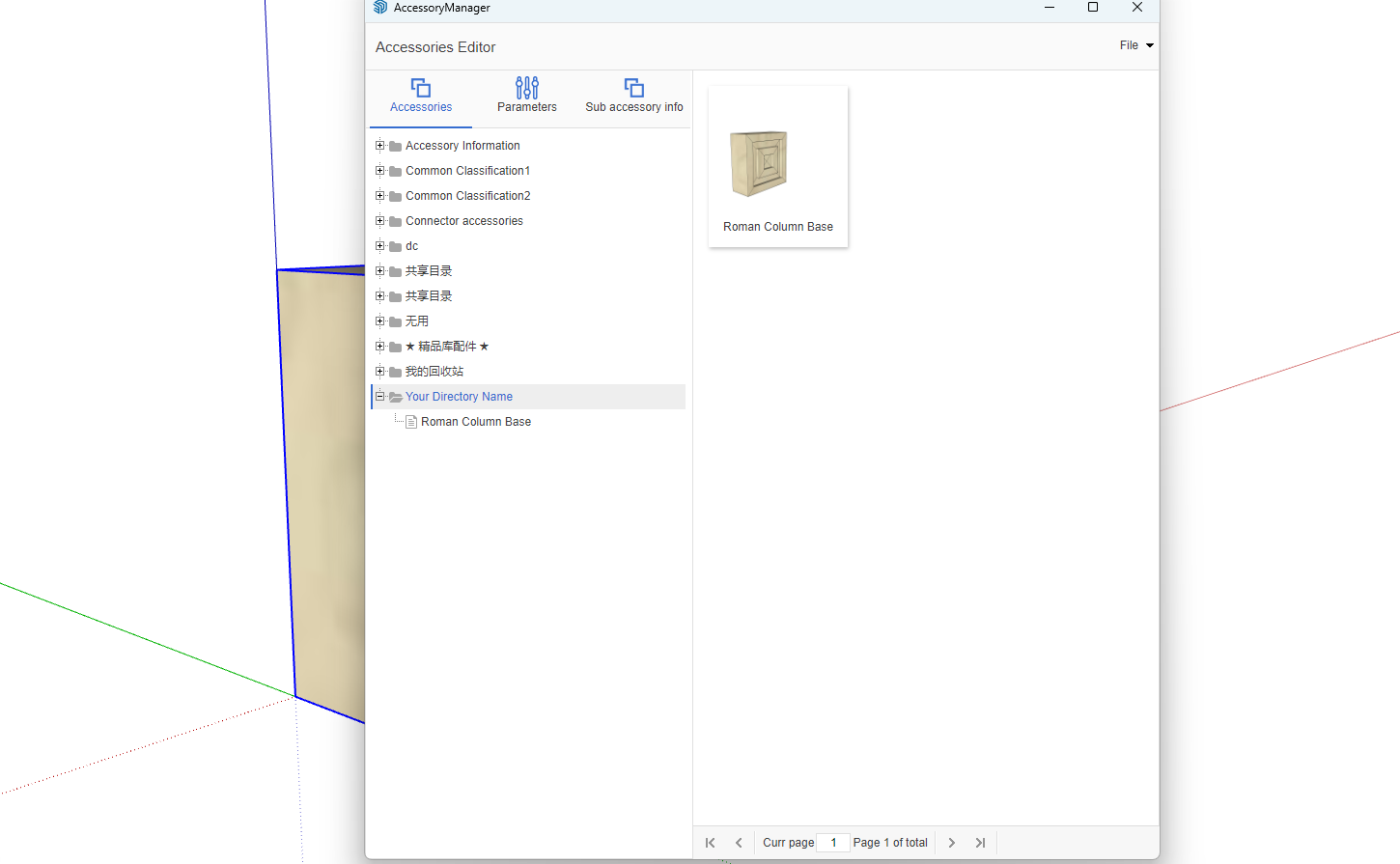 - Upload the model to the accessory model library. Select the column base model and open the Accessory Model Management