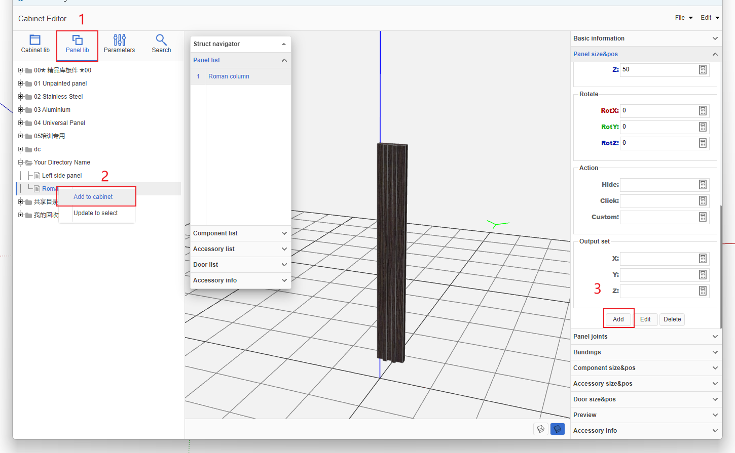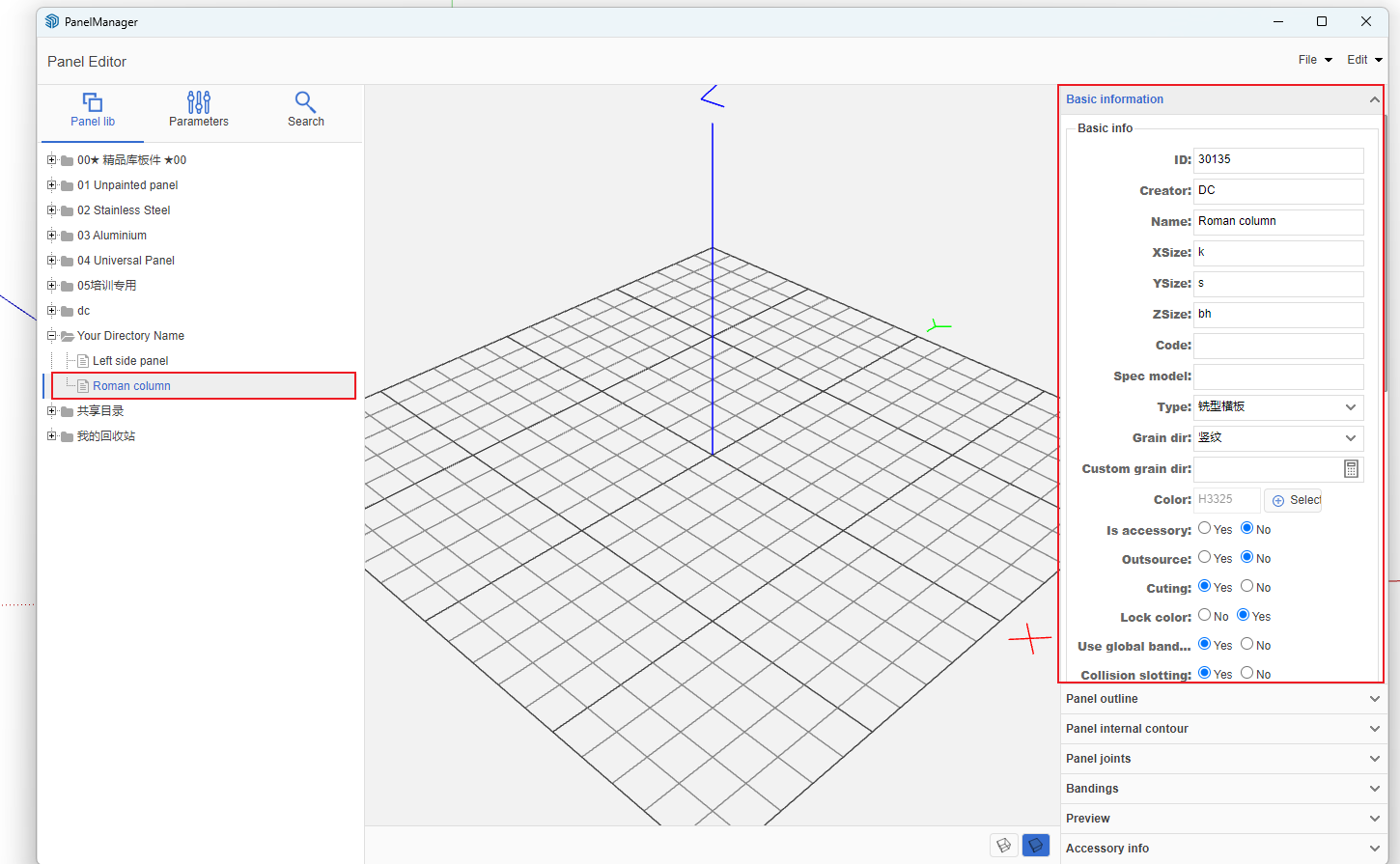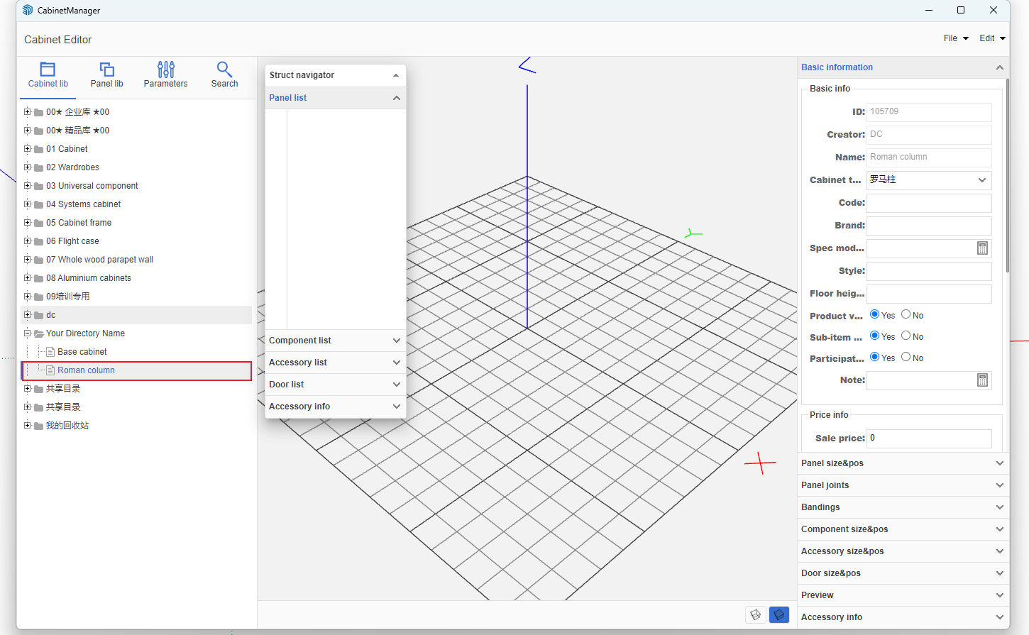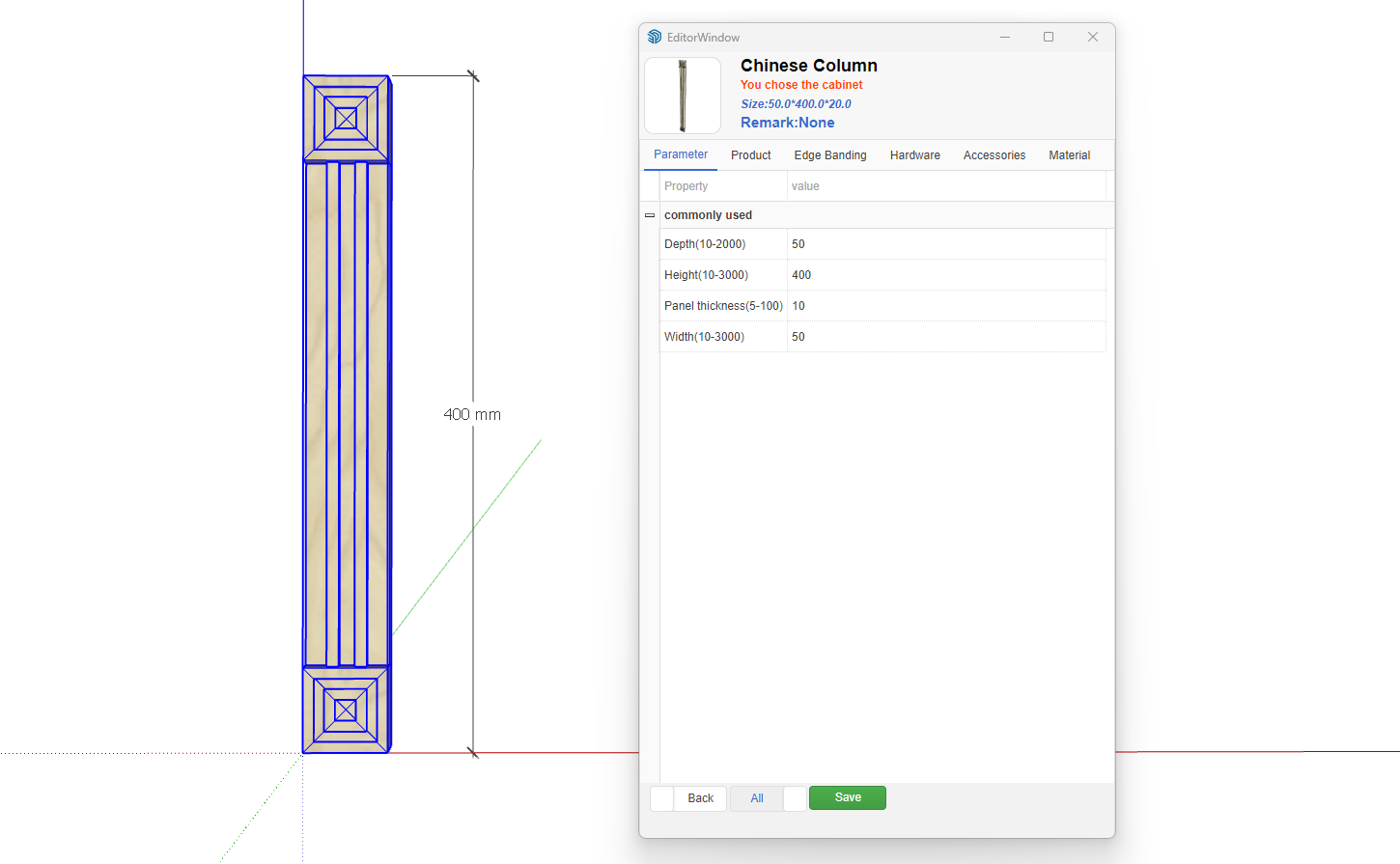 The Zhumu Furniture Design System supports creating parametric models of any shape, such as uniquely shaped Roman columns. Typically, Roman columns can adapt to different heights while maintaining a fixed width. Essentially, whether it's Roman columns or other parametric models, they are composed of panels, accessory models, etc. For authentic Roman columns, both the column capital and base feature unique shapes, which can be modeled in SketchUp and used as parametric accessories. The middle section is implemented using panels.