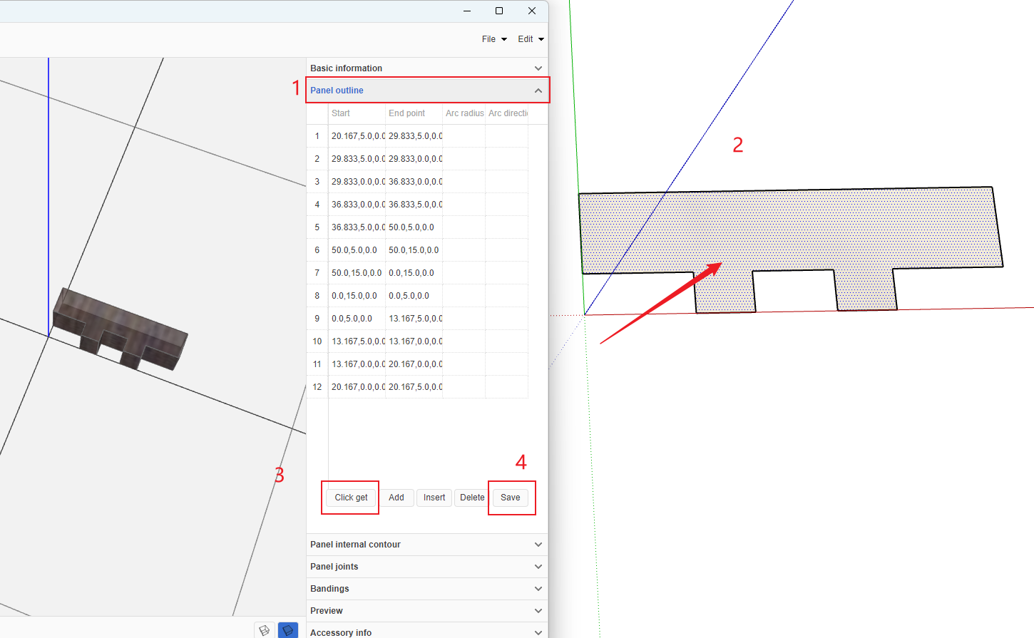 - In the SketchUp scene, draw a column shaft plane (uniquely shaped) and place it at the zero point. In the Panel Management under Production Information -> Panel Outline, click "Get" to capture the outline. After successful capture, click the Save button. The specially shaped panel is now created