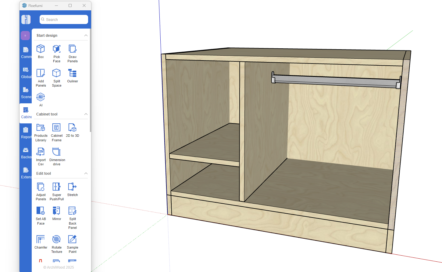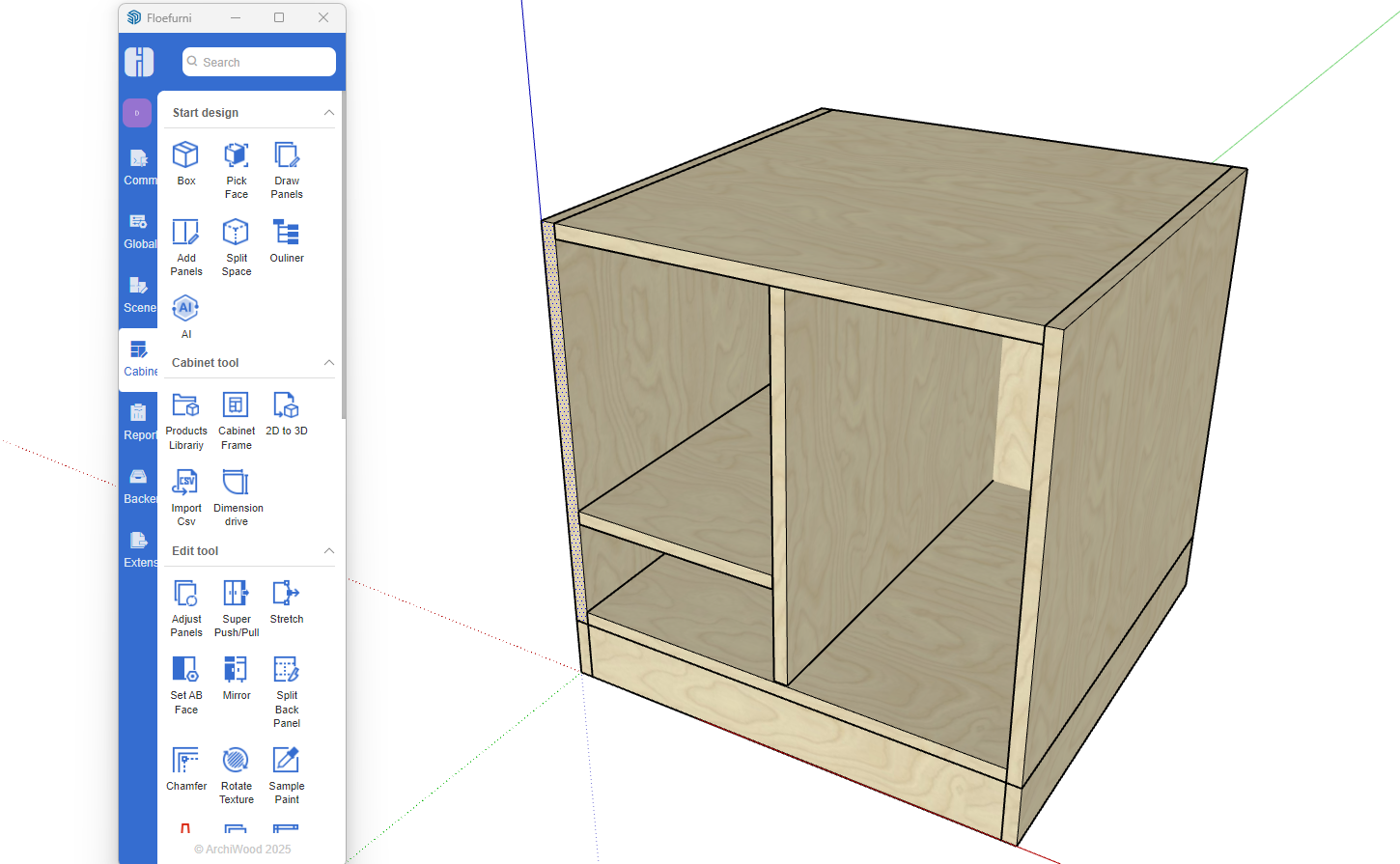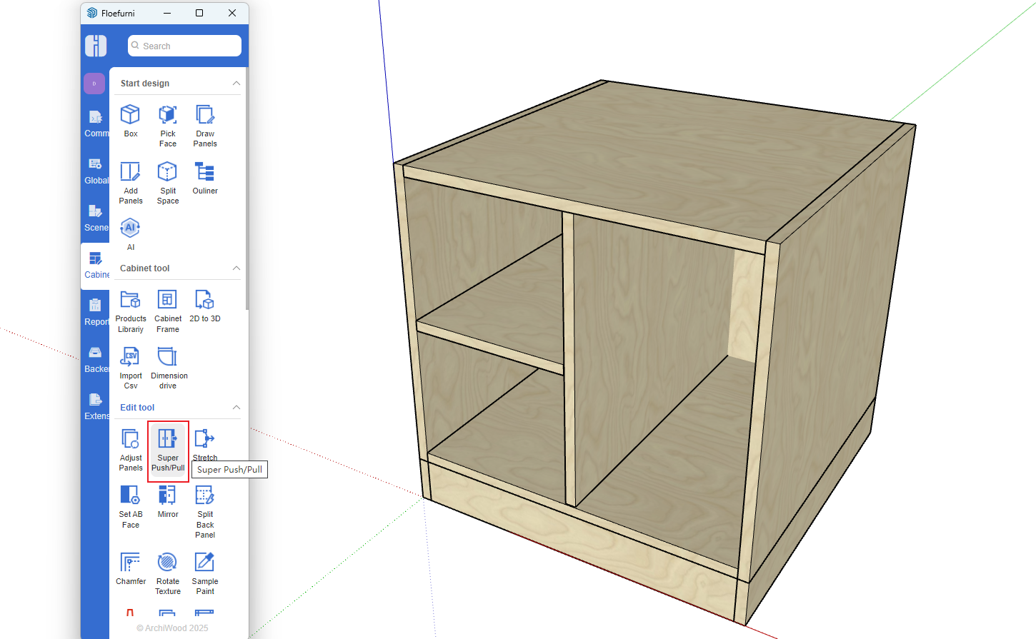 The Super Push/Pull tool can quickly modify panel thickness and dimensions, and can also push/pull cabinet dimensions, internal space dimensions, panel positions, etc.