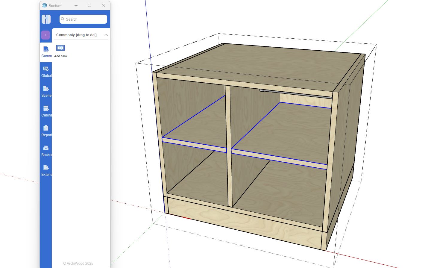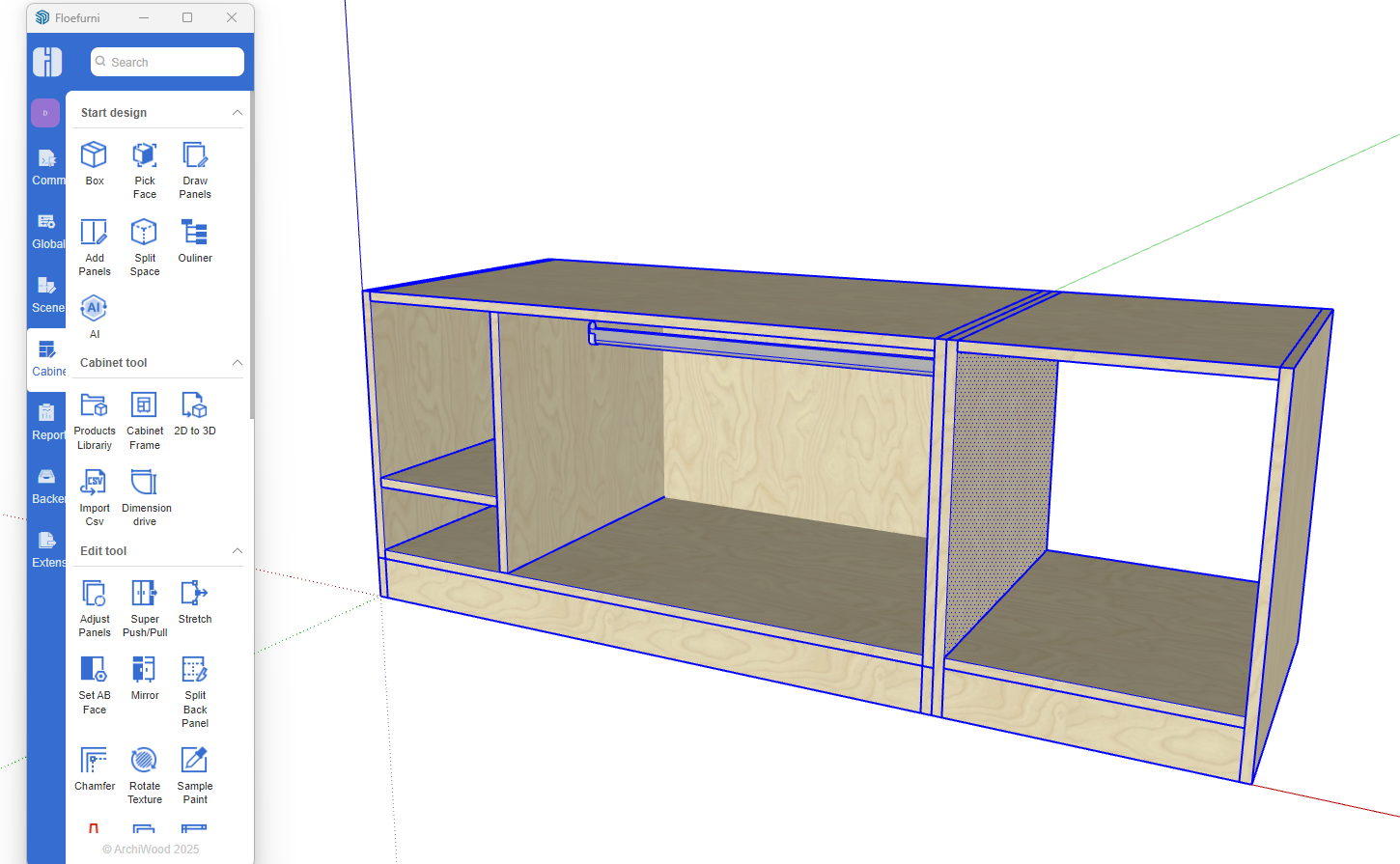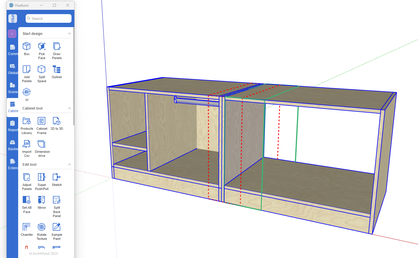 The Super Push/Pull tool can quickly modify panel thickness and dimensions, and can also push/pull cabinet dimensions, internal space dimensions, panel positions, etc.