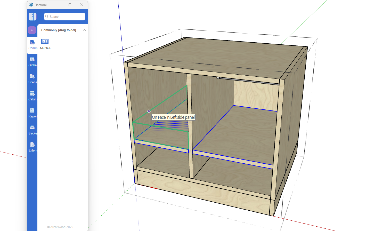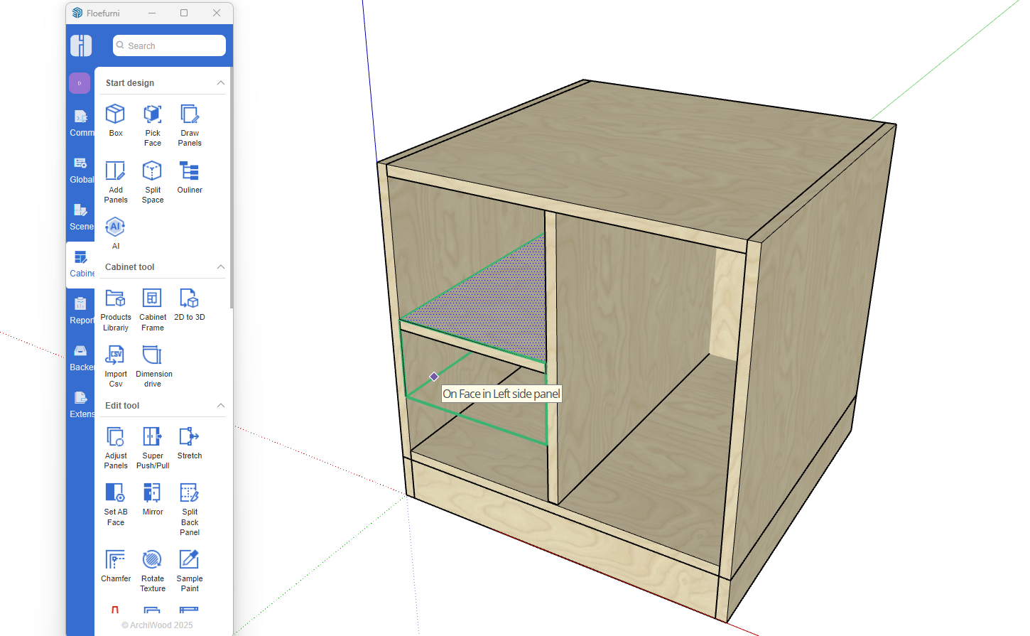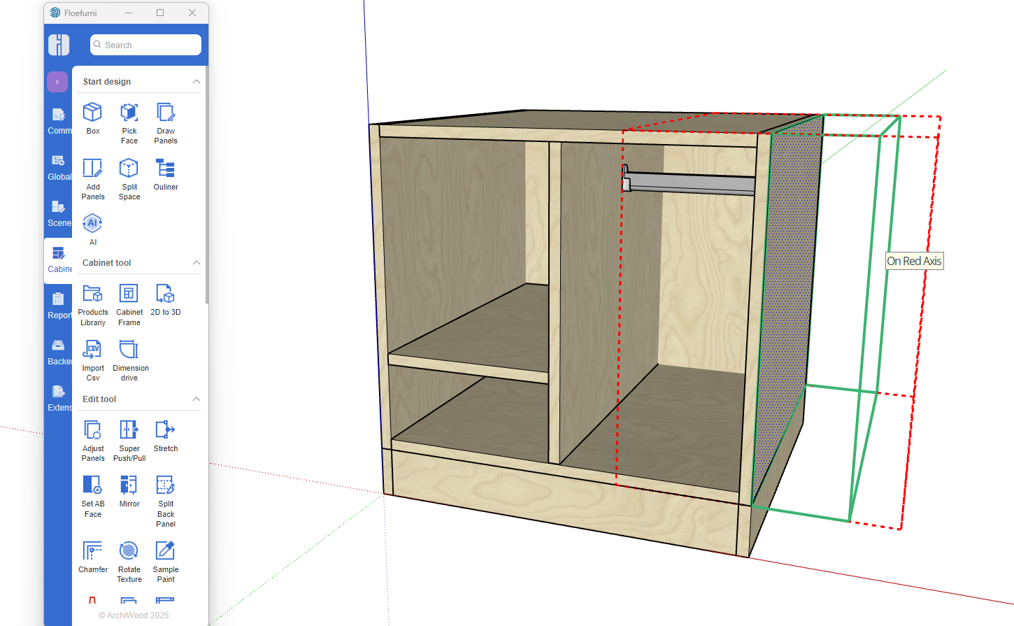 - Move the mouse to the face of the cabinet panel, click and drag to push/pull