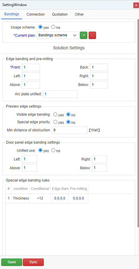 - When "Uniform Use" is set to "Yes", all door panels will use uniform edge banding settings.