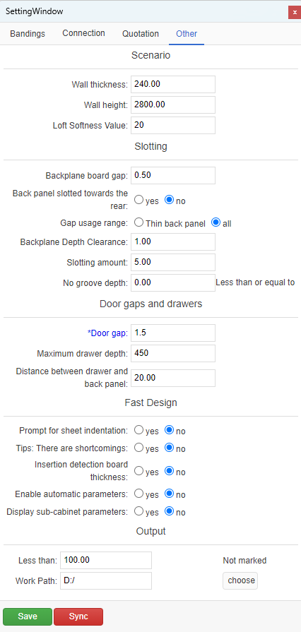Set the default maximum drawer depth in "Drawers". This serves as a reference value when automatically adding drawers to internal spaces. Set the distance from back panel according to requirements, typically 10-20mm.